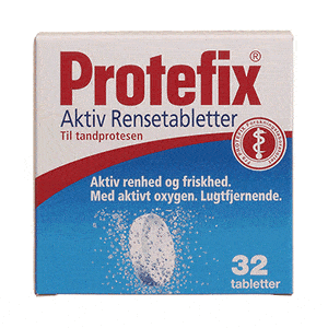 PROTEFIX Rensetabletter God hygiejne ved brug af tandprotese, sikres ved mindst én gang i døgnet at komme tandprotesen i et glas lunkent vand med en PROTEFIX rensetablet. (Læs mere)